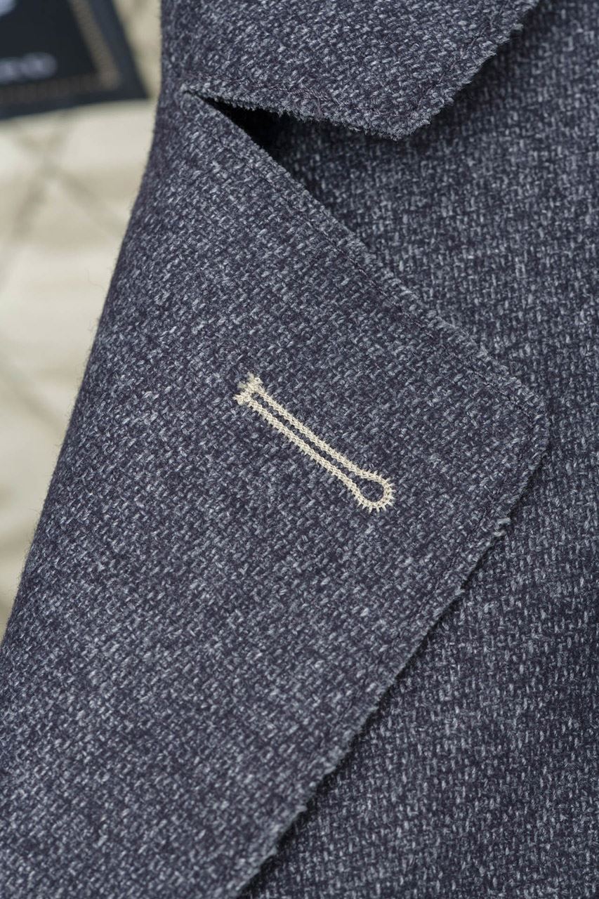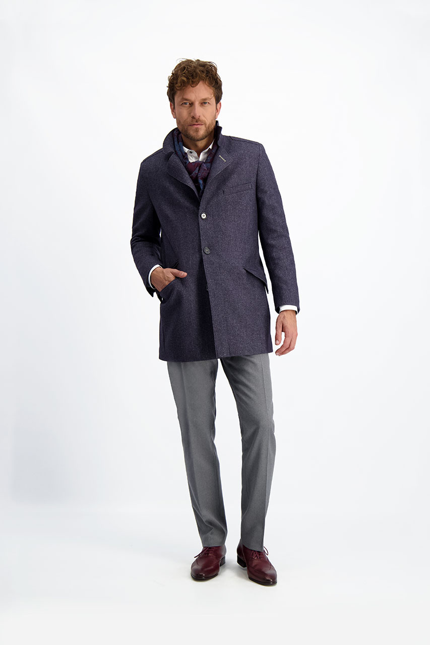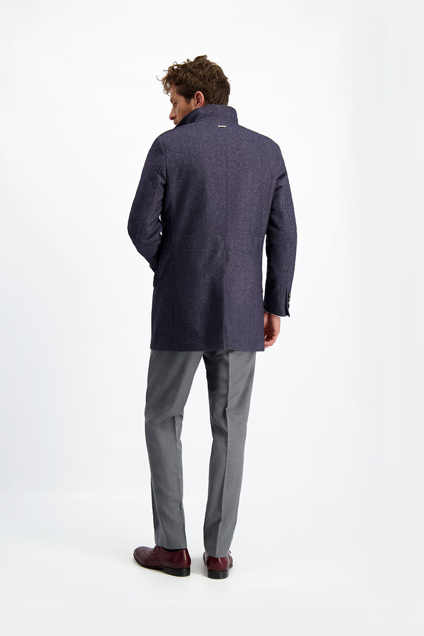 Oryginalny płaszcz męski utrzymany w kolorystyce granatowego melanżu. Innowacyjne wykończenia w postaci tzw. surowych szwów oraz ozdobne pagony na ramionach podkreślają jego nieformalny charakter. Model posiada klasyczny kołnierz, kieszenie zakończone patką, zegarkówkę oraz jednowypustkową kieszeń piersiową. Butonierka i guziki przy rękawach obszyte kontrastową, jasną nicią. Płaszcz o kroju slim, doskonale podkreślający sylwetkę. Znakomicie uzupełni codzienną, miejską stylizację. Klasyczny męski model w nowoczesnym wydaniu.