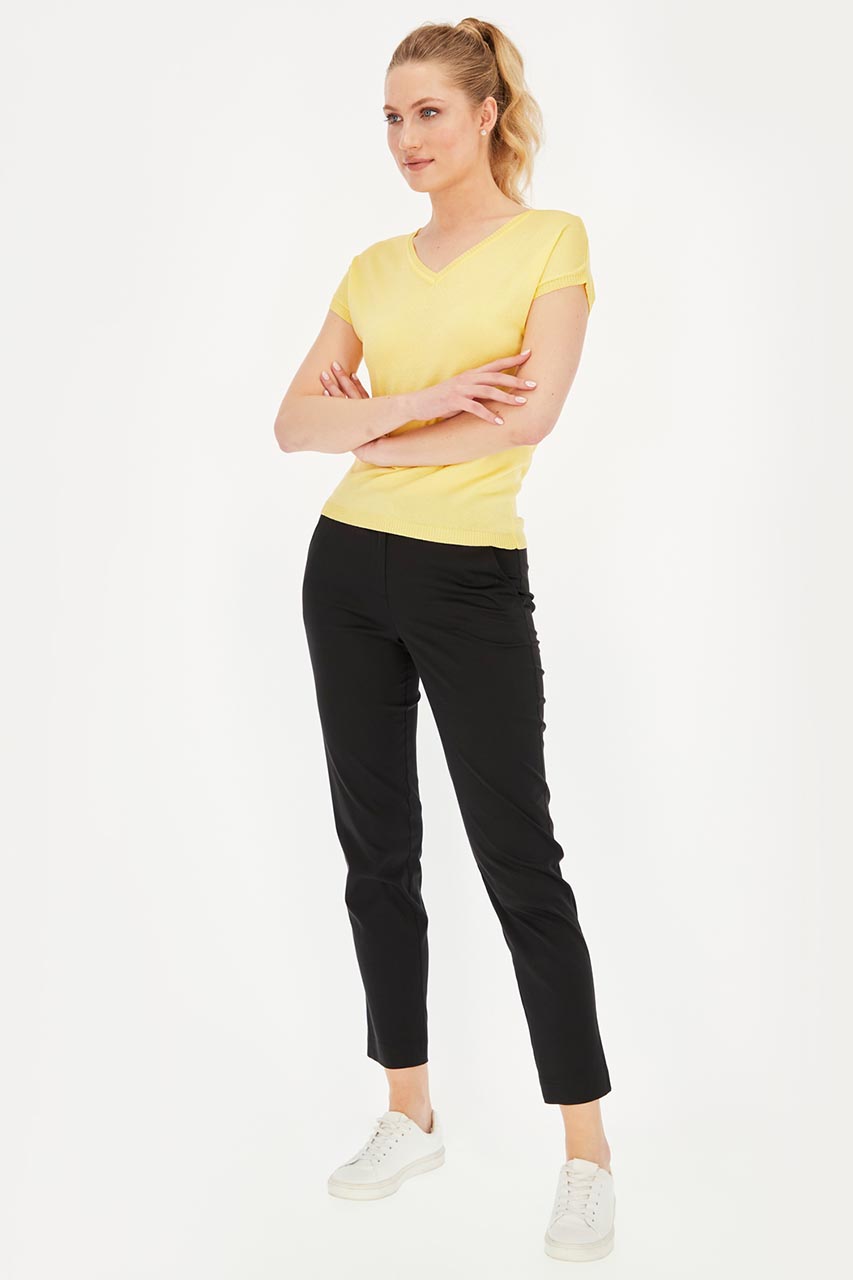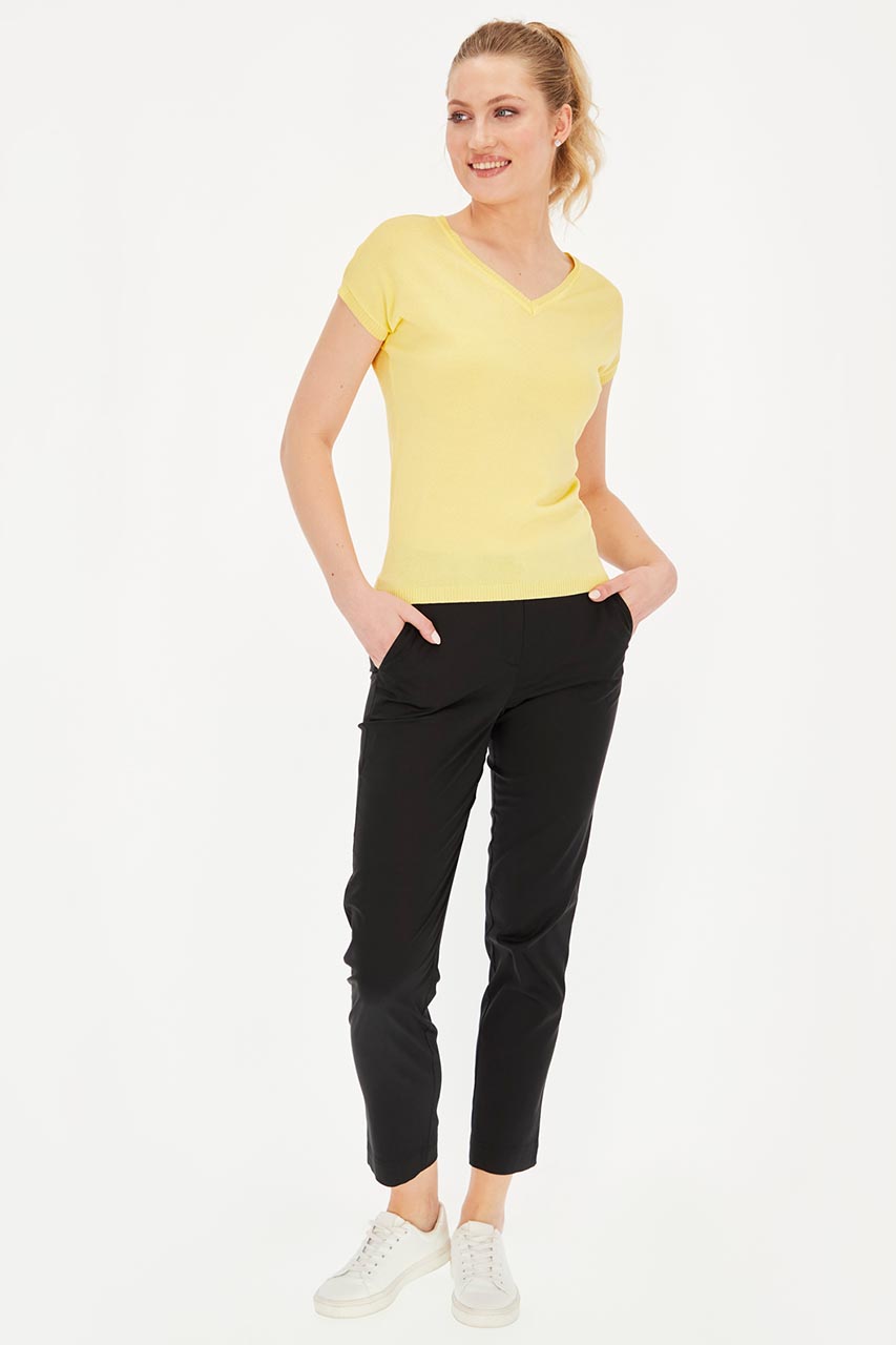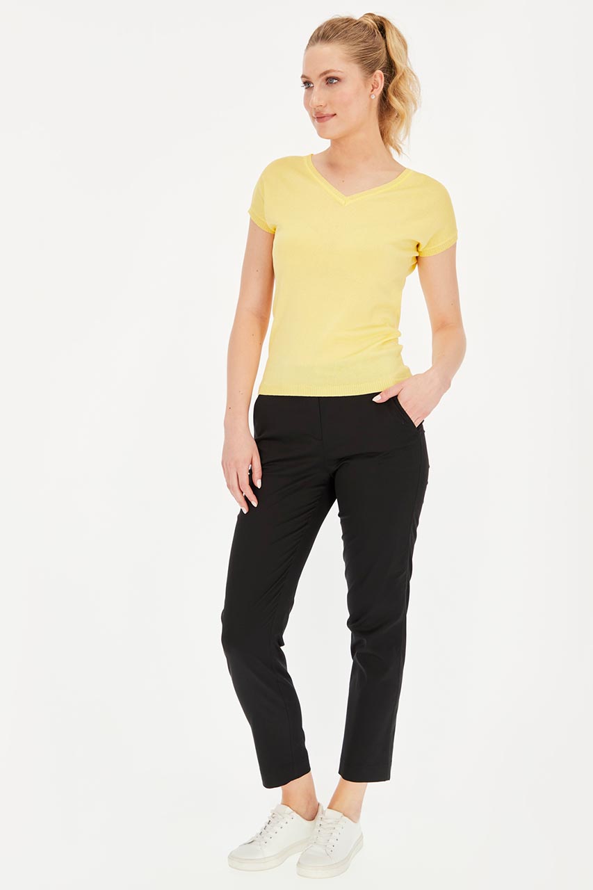Żółta bluzka damska wykonana z przyjemnej dzianiny z rayonem. Rayon zaliczany jest do grupy tkanin oddychających, dzięki temu bluzka jest doskonałym wyborem na gorące dni, kiedy utrzymanie komfortu staje się naprawdę ważne. Co więcej, dzięki swojej strukturze rayon zapewnia niezwykle przyjemne wrażenie subtelnego chłodu. Oferowany model bez rękawów i z dekoltem v-neck. Bluzka świetnie spisze sie w rozmaitych wiosenno-letnich stylizacjach.