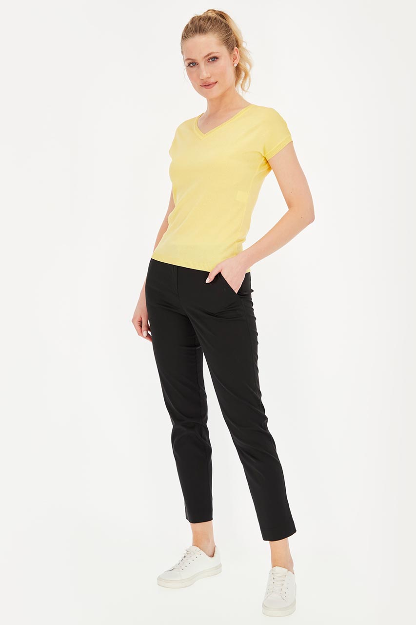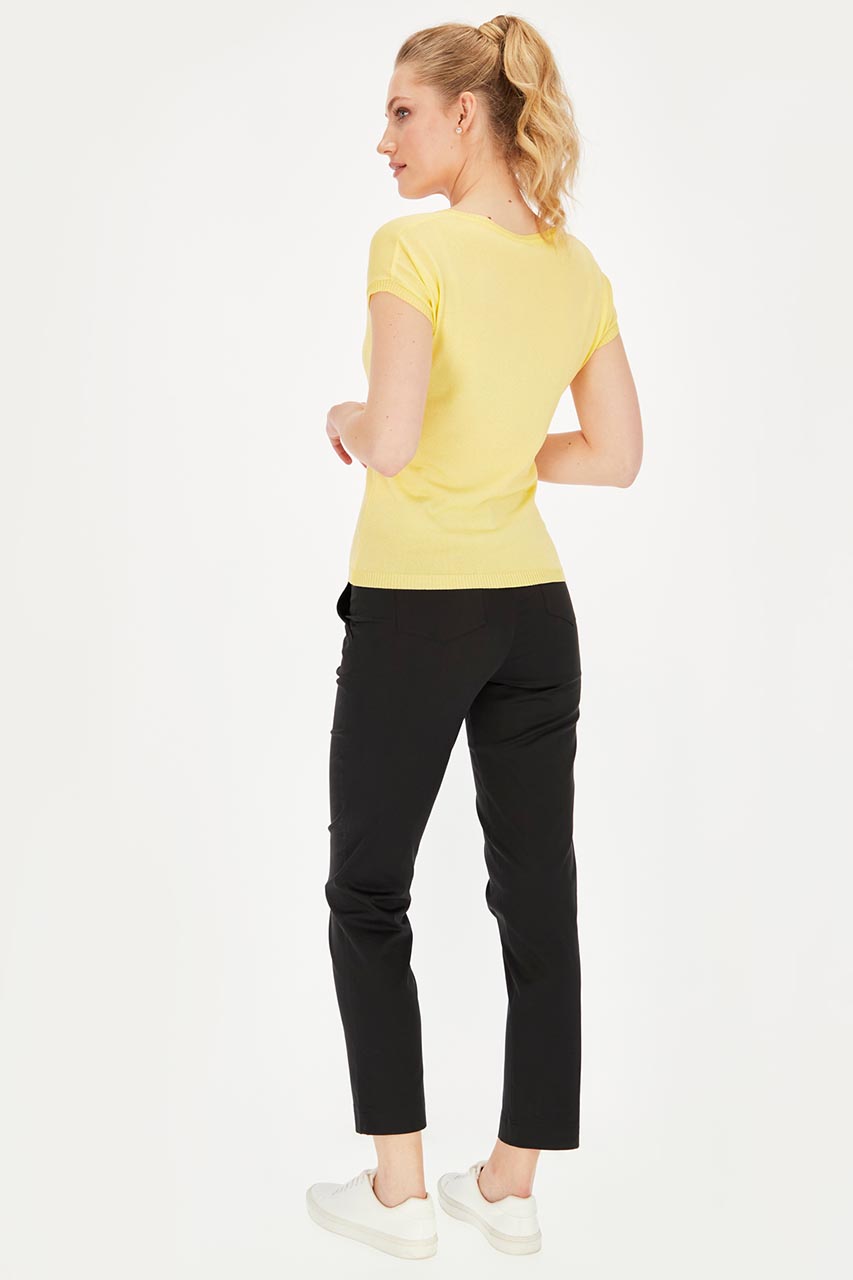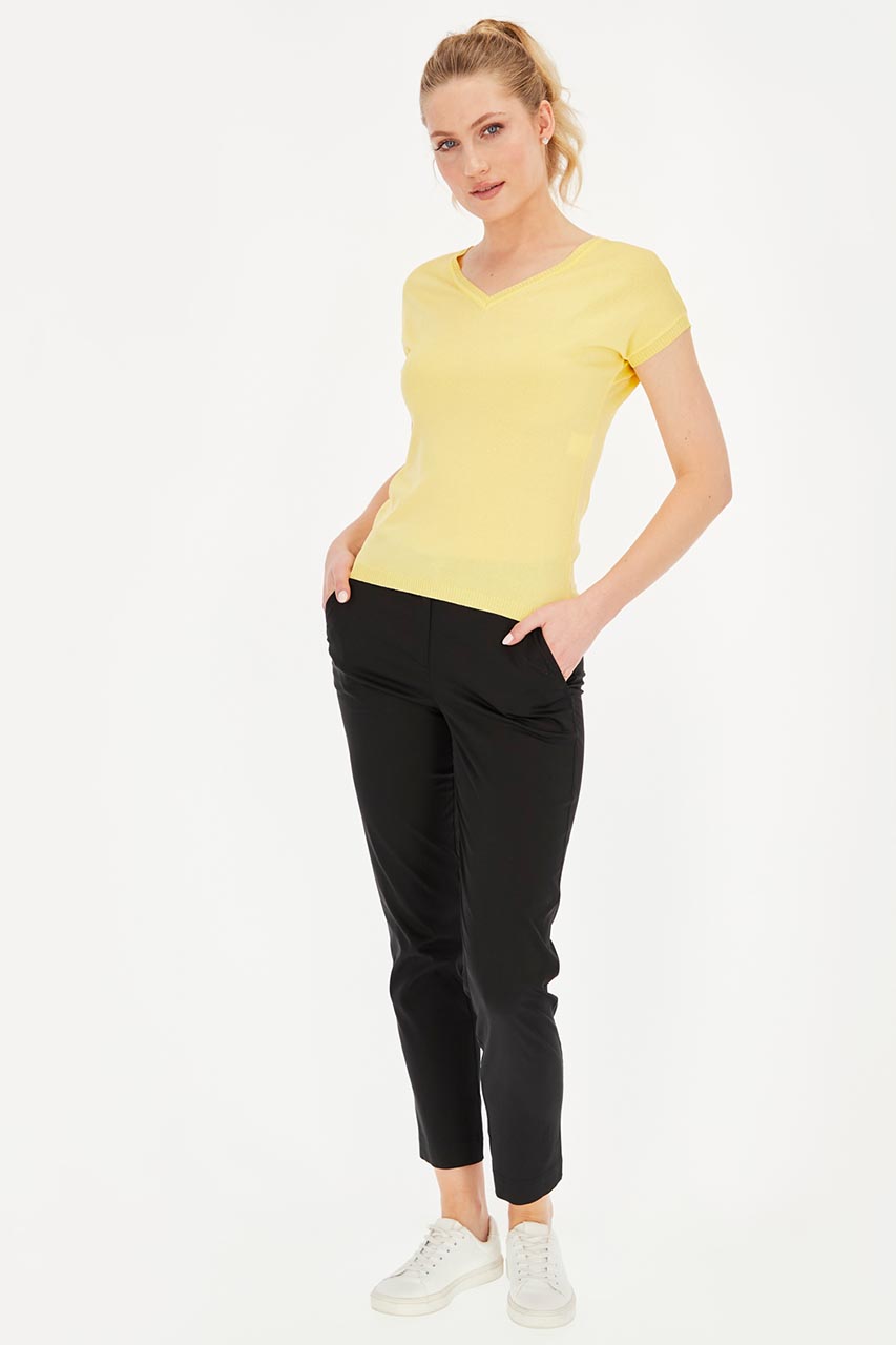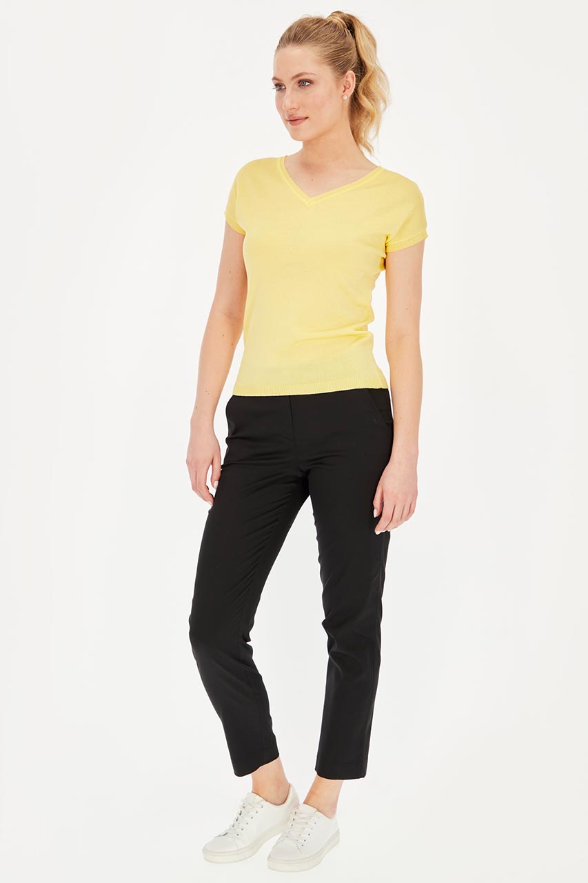 Żółta bluzka damska wykonana z przyjemnej dzianiny z rayonem. Rayon zaliczany jest do grupy tkanin oddychających, dzięki temu bluzka jest doskonałym wyborem na gorące dni, kiedy utrzymanie komfortu staje się naprawdę ważne. Co więcej, dzięki swojej strukturze rayon zapewnia niezwykle przyjemne wrażenie subtelnego chłodu. Oferowany model bez rękawów i z dekoltem v-neck. Bluzka świetnie spisze sie w rozmaitych wiosenno-letnich stylizacjach.