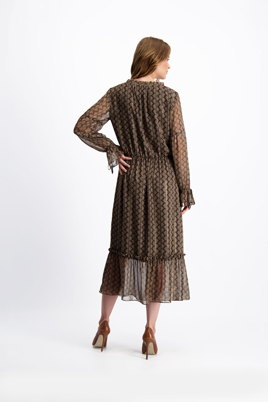 Zwiewna sukienka we wzory to jeden z najgorętszych trendów tego sezonu. Model z gumką w pasie i wiązaniem przy dekolcie. Sukienka utrzymana w pięknej kolorystyce cynamonu, granatu i khaki. Propozycja pięknie prezentuje się ze szpilkami, z kolei z botkami stworzy świetny klimat boho.