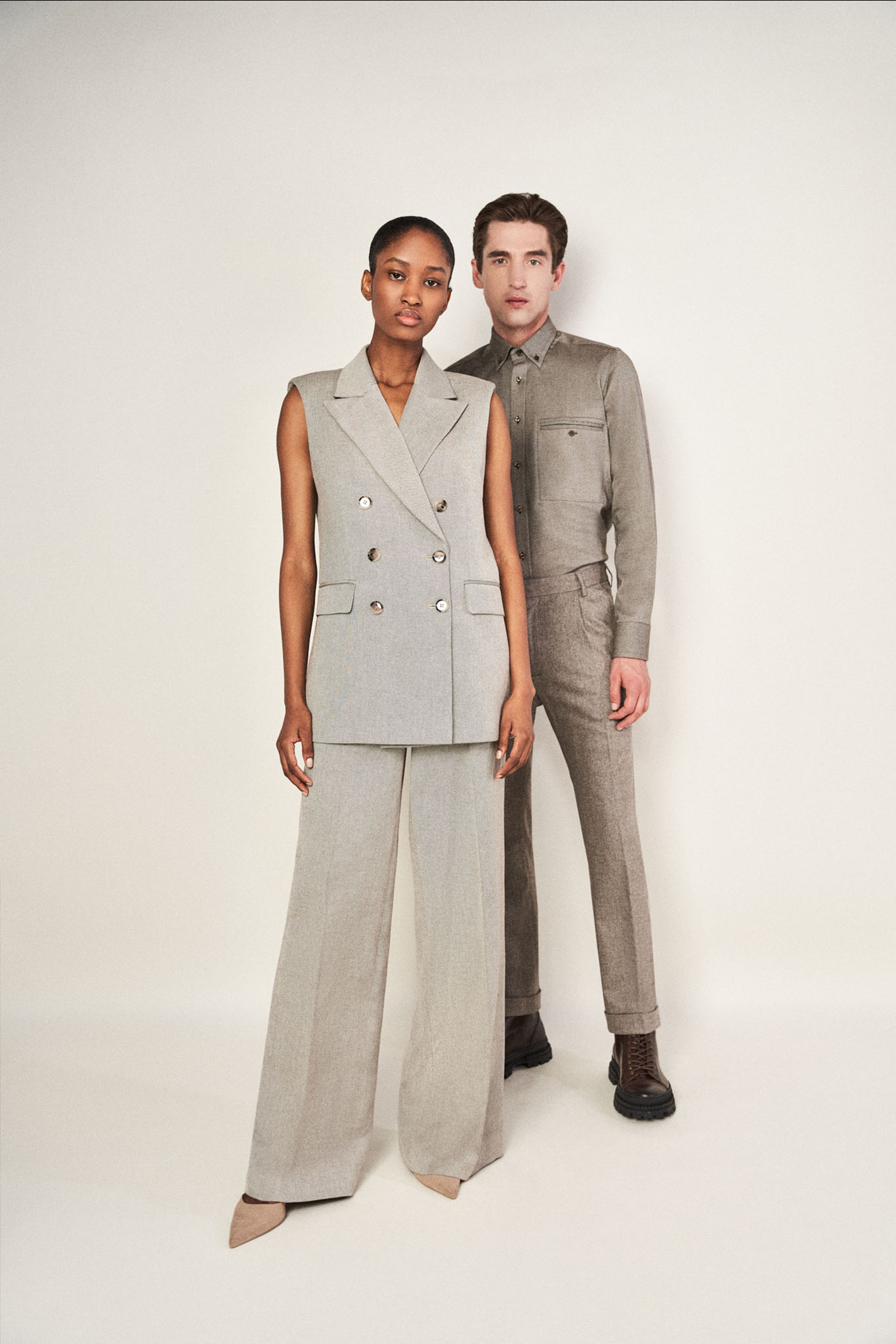 Beżowa kamizelka wykonana z bawełnianej tkaniny o diagonalnym splocie pochodzącej od włoskiego producenta PROFILI TESSILE. Kamizelka dwurzędowa, posiada wzmocnione poduszkami ramiona. Kamizelka ze spodniami (86727) oraz overshirtem (86725) z tej samej tkaniny tworzą zestaw.