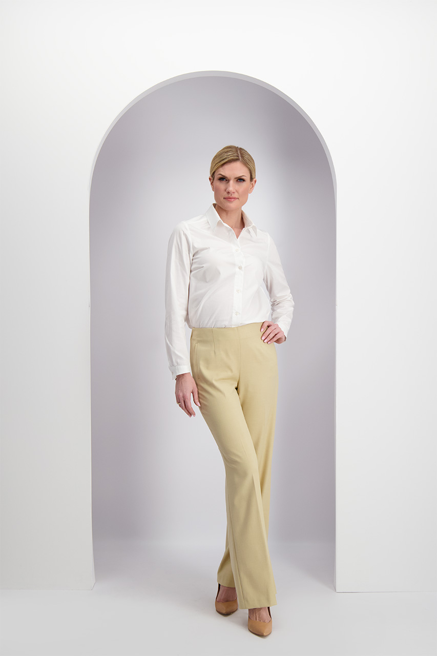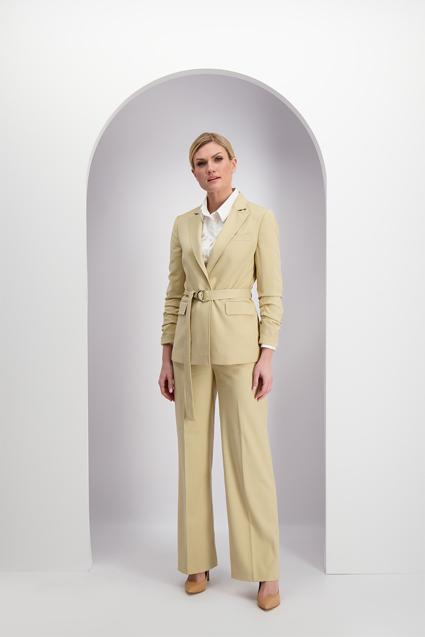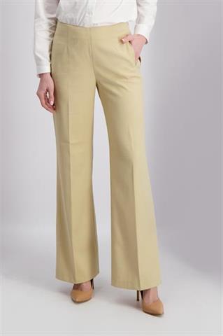 Spodnie damskie w pięknym, ciepłym odcieniu beżu. Model z szerokimi nogawkami zaprasowanymi na kant, który dodatkowo optycznie wydłuży nogi. Spodnie zapinane z boku na kryty zamek, dodatkowo z tyłu wszyta gumka w pasie, dzięki czemu spodnie idealnie dopasowują sie do sylwetki. To propozycja, która z marynarką z tej samej tkaniny tworzy efektowny garnitur damski, który doskonale odnajdzie się zarówno w pracy jak i podczas rodzinnych uroczystosci. Wzrost modelki to 177, nosi rozmiar S.