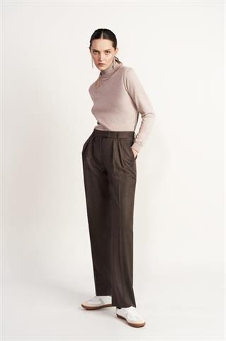 Brązowe spodnie wykonane z wełnianej flaneli. Nogawka lekko zwężana ku dołowi. Wnętrze spodni z klasycznym gurtem nawiązującym do sztuki krawiectwa. Spodnie z marynarką (86749) z tej samej tkaniny tworzą garnitur.