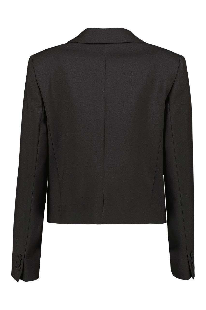 Krótki żakiet damski w odcieniu ponadczasowej czerni. Model na podszewce i z szerszymi klapami kołnierza. Eleganckim akcentem, na który warto zwrócić uwagę to powlekane guziki ta samą tkaniną. Żakiet jest uniwersalną propozycją, która świetnie sprawdzi się zarówno z klasycznymi sukienkami jak i z cygaretkami lub jeansami. W zależności od doboru dodatków będzie świetnie się prezentował w pracy, podczas rodzinnej uroczystości jak i na spotkaniu z przyjaciółkami.