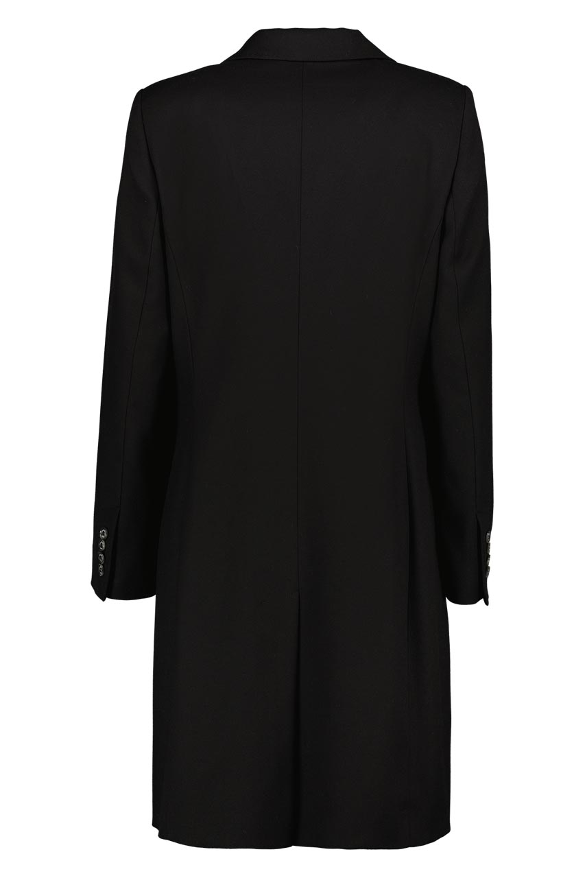 Klasyczny, wiosenny płaszcz jednorzędowy o fasonie dyplomatki w ponadczasowym, czarnym kolorze. Wykonany z wyjątkowo miękkiej tkaniny z dodatkiem wiskozy. W odpowiedzi na najnowsze trendy wyraźnie zaznaczone zostały szpiczaste klapy kołnierza, które dodatkowo posiadają szwy AMF nawiązujące do tradycyjnego krawiectwa. Płaszcz posiada subtelne taliowanie oraz kieszenie z patkami i brustaszę. Fantastycznie układa się na sylwetce. Płaszcz jest ambasadorem najwyższej klasy i elegancji, co oznacza że sprawdzi się znakomicie podczas wyjątkowych okazji. Dzięki długości za kolano fantastycznie współgra z sukienkami biznesowymi, a także może stanowić zgrany duet z granatowym lub czarnym garniturem. Modelka ma 175 cm wzrostu. Prezentuje rozmiar 36.