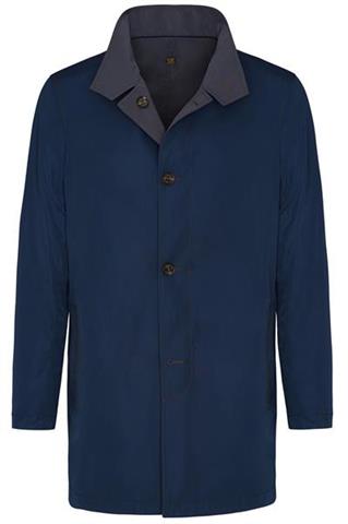 Dwustronny płaszcz wiosenny męski utrzymany w casualowym charakterze. Model dwustronny, jedna strona w granatowym odcieniu, natomiast druga w szarej tonacji. Płaszcz o regularnym kroju zapinany na guziki. Posiada dwie cięte kieszenie. Fajna propozycja do luźnych zestawień.