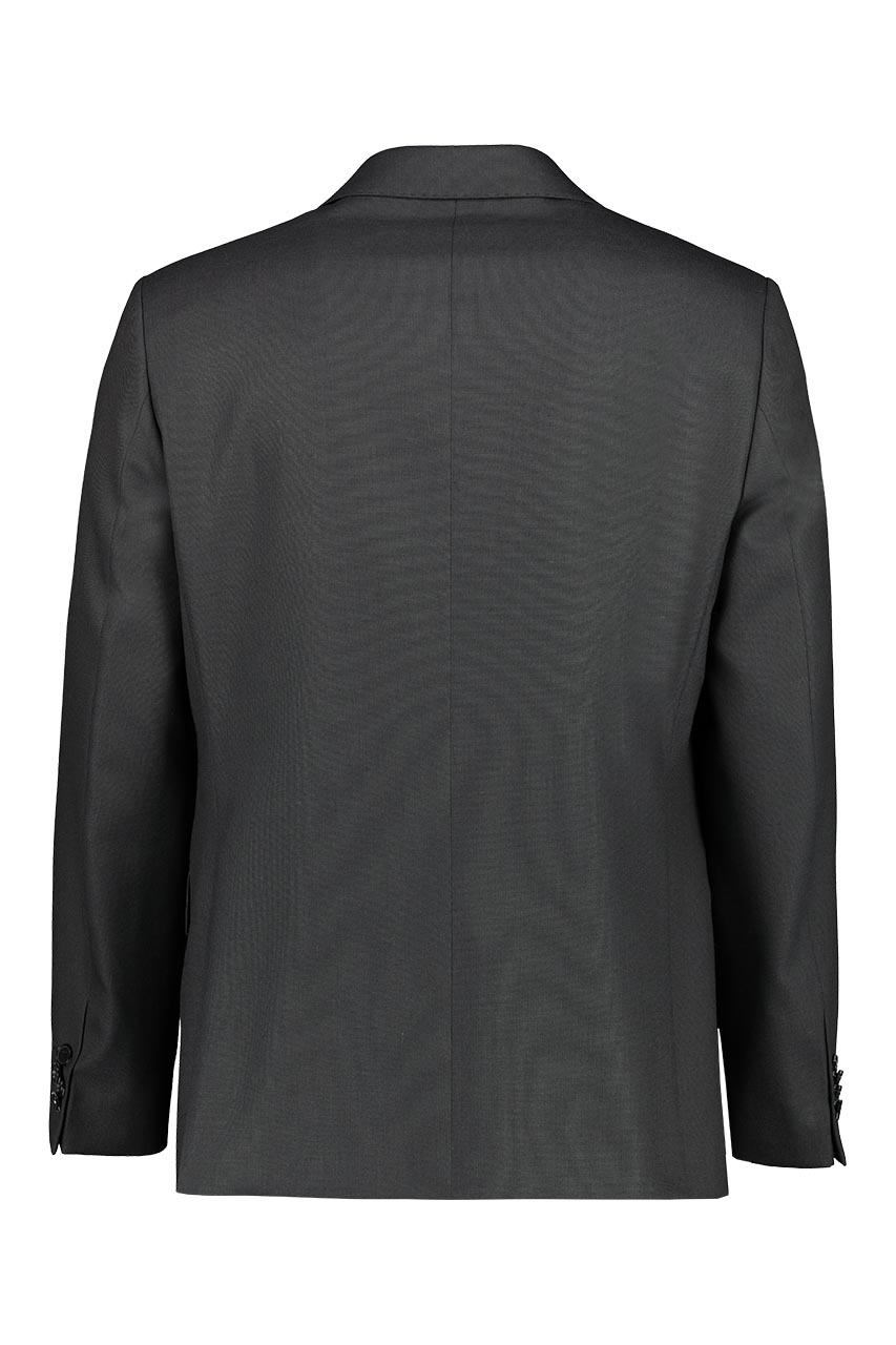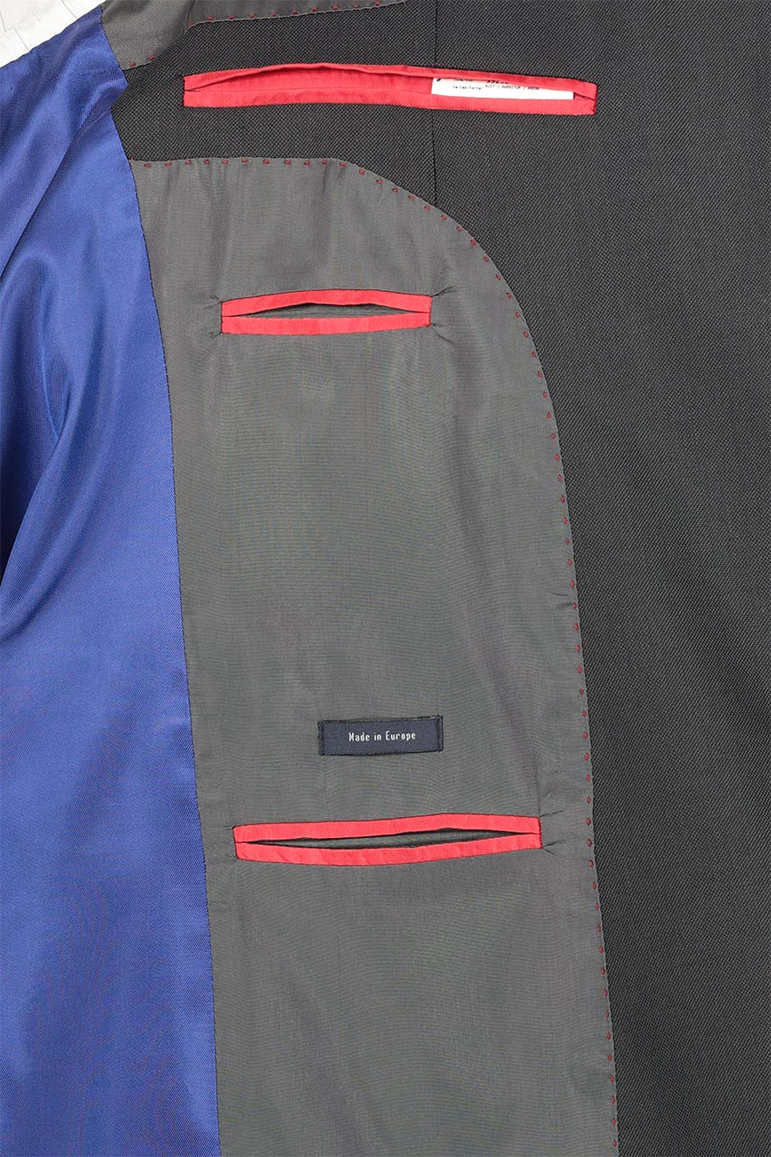 Grafitowy garnitur męski na wesele wykonany w 80% z najwyższej jakości wełny. Domieszka włókien syntetycznych wpływa niezwykle korzystnie na komfort użytkowania. Marynarka z wąskimi klapami obszytymi ozdobnym szwem AMF nawiązującym do tradycyjnego krawiectwa, zapinana na dwa guziki. Posiada dwie kieszenie z klasyczną patką oraz jedną kieszeń piersiową. Kołnierz podszyty filcem w czerwonym kolorze. Spodnie z podwyższonym tyłem, zapinane na zamek, guzik i haczyk spodniowy. Posiadają z przodu dwie skośne kieszenie oraz dwie tylne dwuwypustkowe zapinane na guzik. Garnitur o modnym i regularnym kroju, dla mężczyzn ceniących komfort i wygodę.