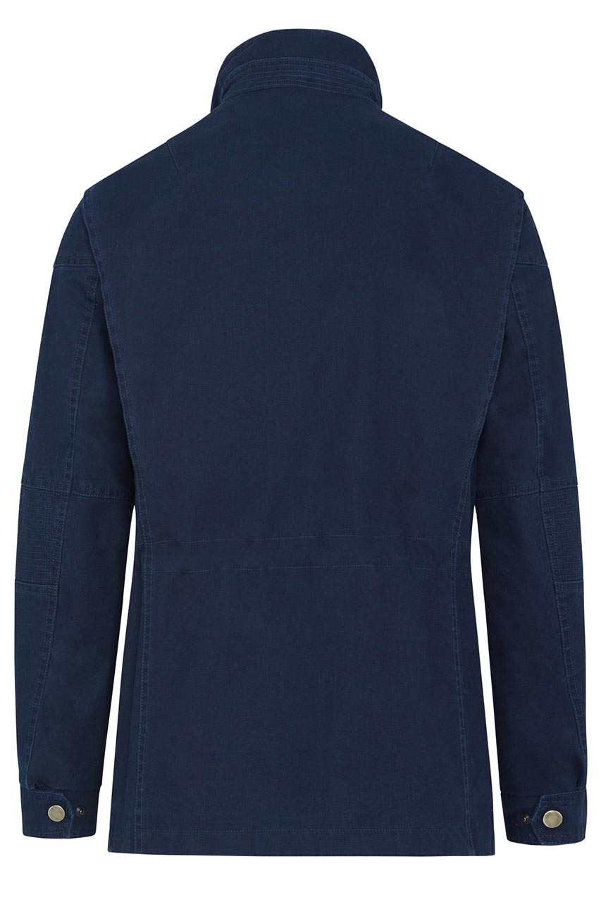 Granatowa kurtka męska w militarnym stylu. Model wykonany z denimu, posiada stójkę i cztery nakładane kieszenie z przodu. Posiada również wszyty tunel do regulacji w pasie. Fantastyczna propozycja do miejskich stylizacji.