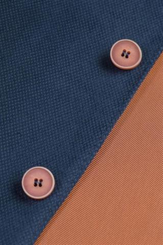 Granatowa marynarka o dopasowanym fasonie. Uszyta z przyjemnej w dotyku tkaniny flok w deseń rombów. Wzdłuż krawędzi marynarki ozdobny szew AMF nawiązujący do tradycyjnego krawiectwa.