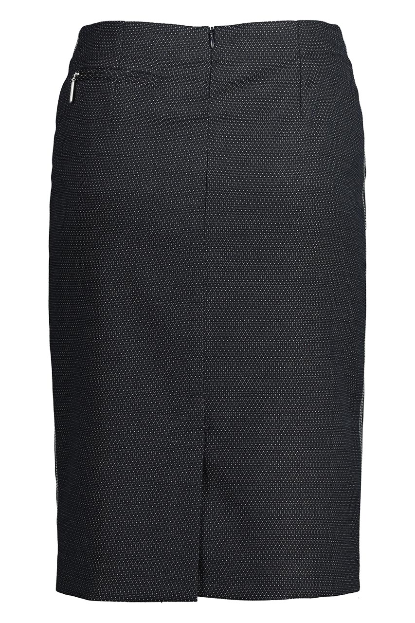Granatowa spódnica ołówkowa w kropki z bardzo przyjemnej tkaniny. Klasyczny elegancki model z rozcięciem z tyłu. Spódnica zapinana z tyłu na kryty zamek. Posiada dwie skośne kieszenie cięte zapinane na zamek oraz jedną małą tylną. To propozycja która pięknie układa się na sylwetce, a w towarzystwie marynarki z tej samej serii (84793) stworzy niebanalny kostium, idealny do pracy.