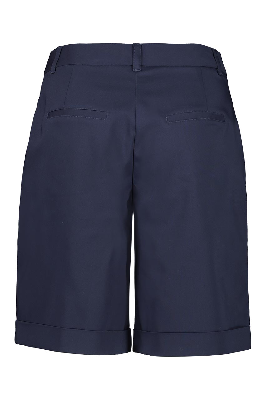Eleganckie spodenki damskie w ponadczasowym odcieniu granatu. Wykonane z bardzo przyjemnej w dotyku tkaniny. Model zapinany na zamek i biżuteryjny guzik. Posiada dwie kieszenie typu chino. Spodenki z mankietami. Z marynarką z tej samej tkaniny tworzy niebanalny garnitur damski, który z pewnością zadowoli każdą elegancką kobietę. Modelka ma 167 cm wzrostu. Prezentuje rozmiar 36.