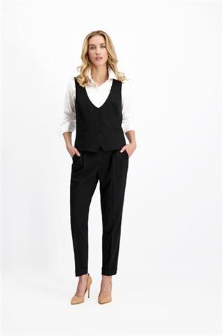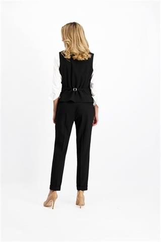 Elegancka, czarna kamizelka damska z jednowypustkowymi kieszeniami oraz zapięciem na 4 logowane guziki. Posiada głęboko wycięty dekolt oraz regulację szerokości z tyłu. Kamizelka jest świetnym uzupełnieniem garnituru. Modelka ma 170 cm wzrostu. Prezentuje rozmiar 36.