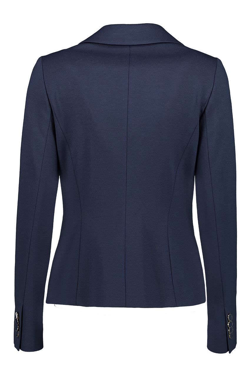 Granatowa marynarka damska w stylu „back to school”. Wykonana z przyjemnej, lekko elastycznej tkaniny. Model z emblematem, zapinany na guziki. Modelka ma 175 c wzrostu i prezentuje rozmiar 36.