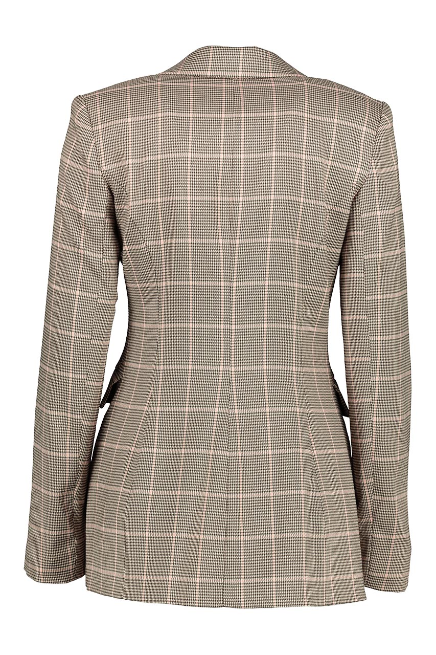 Marynarka damska w kratę. Model dwurzędowy o klasycznym fasonie. Modelka ma 177 cm wzrostu i prezentuje rozmiar 36.