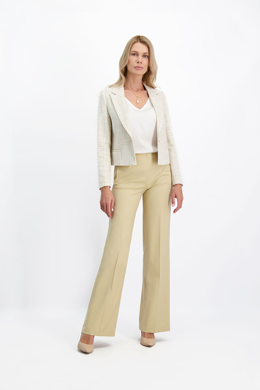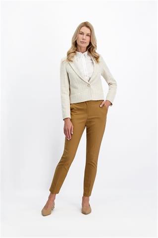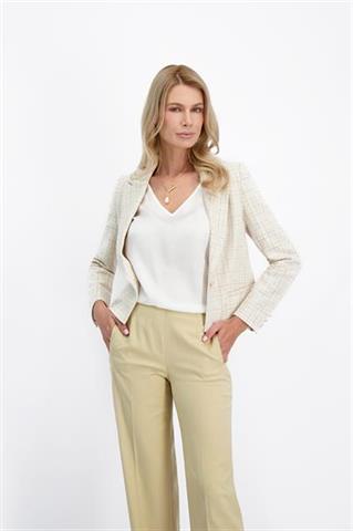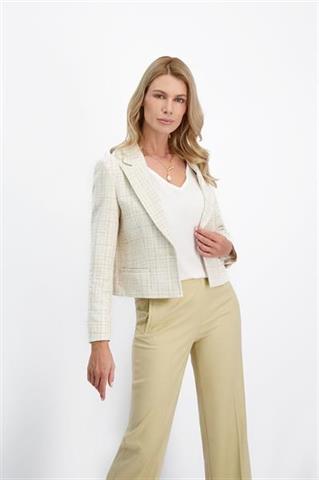 Marynarka damska o krótszym kroju, uszyta ze strukturalnej tkaniny. Model w pięknym odcieniu écru przeplatany srebrną i beżową nitką. Uzyskany efekt jest oszałamiajacy, marynarka prezentuje się niezwykle elegancko i stylowo. Model zapinany na jeden biżuteryjny guzik. Marynarka ze spódnicą ołówkową z tej samej tkaniny tworzy modny i elegancki kostium damski, idealny na ważne uroczystości.