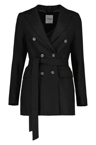 Wełniana dwurzędowa marynarka damska w odcieniu czerni. Model można nosić w formie krótkiego płaszczyka lub klasycznej marynarki. Marynarka została uszyta z tkaniny wełnianej. Modelka ma 171 cm wzrostu i prezentuje rozmiar 36. Wyprodukowano w Polsce.