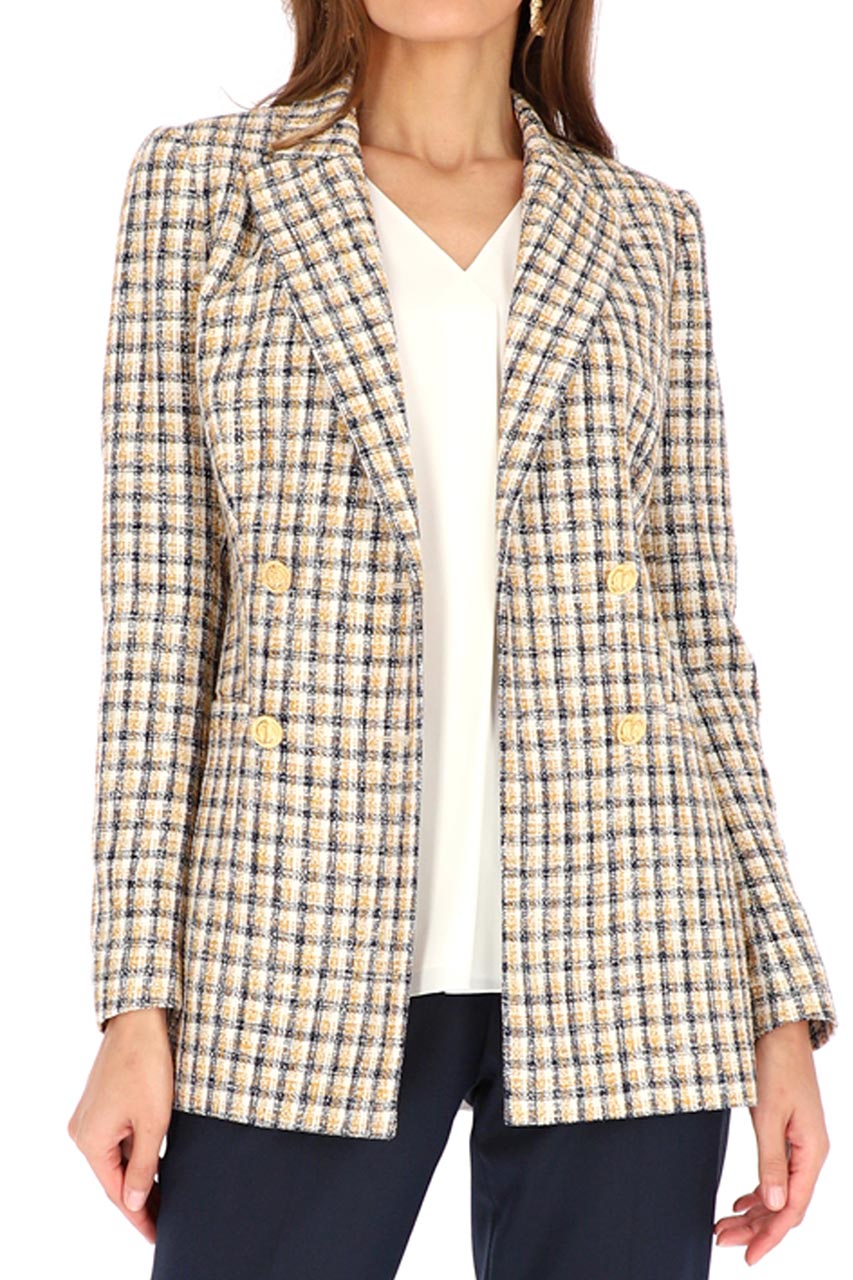 Piękna dwurzędowa marynarka uszyta z bardzo przyjemnej tkaniny z wyraźną strukturą. Model utrzymany w pieknej kolorystyce bieli, granatu i zgaszonego żółtego. Eleganckim akcentem, który wprowadza odrobinę sznytu są biżuteryjne guziki w złotym odcieniu. Marynarka jest bardzo funkcjonalna, z powodzeniem zastąpi okrycie w cieplejsze, wiosenne dni.