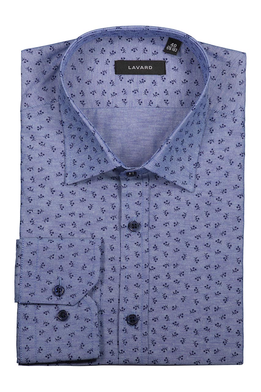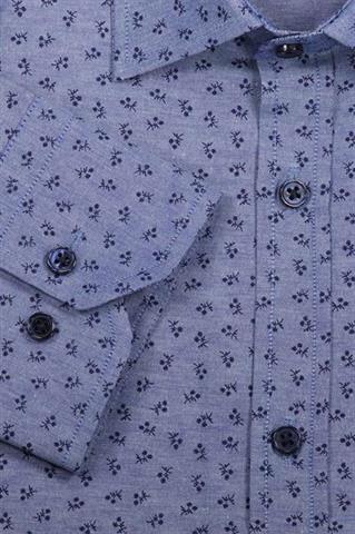 Koszula męska w niebieskim odcieniu w drobny granatowy wzór. Model o dopasowanym kroju slim, który świetnie układa się na sylwetce podkreślając jej atuty. Koszula z długim rękawem i klasycznym kołnierzykiem. Zapinana na guziki w granatowym kolorze. Koszula świetnie prezentuje sie solo ze spodniami chino jak i w zestawie z marynarką lub kamizelką.