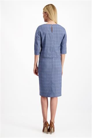 Niebieska spódnica w kratę tzw. windowpane. Piękny model wykonany z wysokiej jakości lnianej tkaniny. Propozycja o klasycznym ołówkowym kroju z jednym rozcięciem z tyłu. Spódnica zapinana z tyłu na kryty zamek. Świetny, elegancki model, który doskonale odnajduje się w biurowych zestawieniach. W towarzystwie bluzki z tej samej tkaniny (85107) tworzy fantastyczną i ciekawą stylizację. Modelka ma 175 cm wzrostu. Prezentuje rozmiar 36.