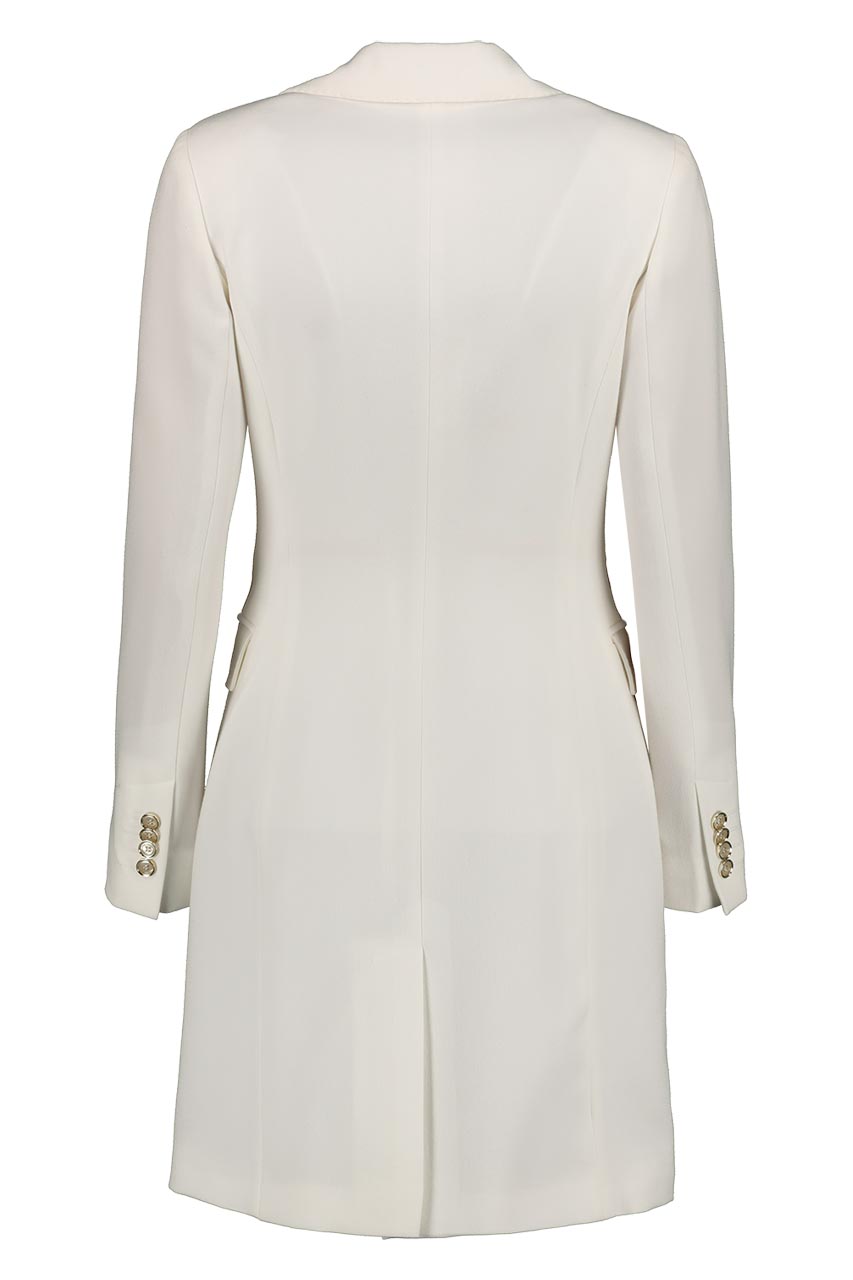 Biały płaszcz damski o klasycznym fasonie dyplomatki. Model lekko taliowany. Wzdłuż krawędzi ozdobny szew AMF nawiązujący do tradycyjnego krawiectwa.