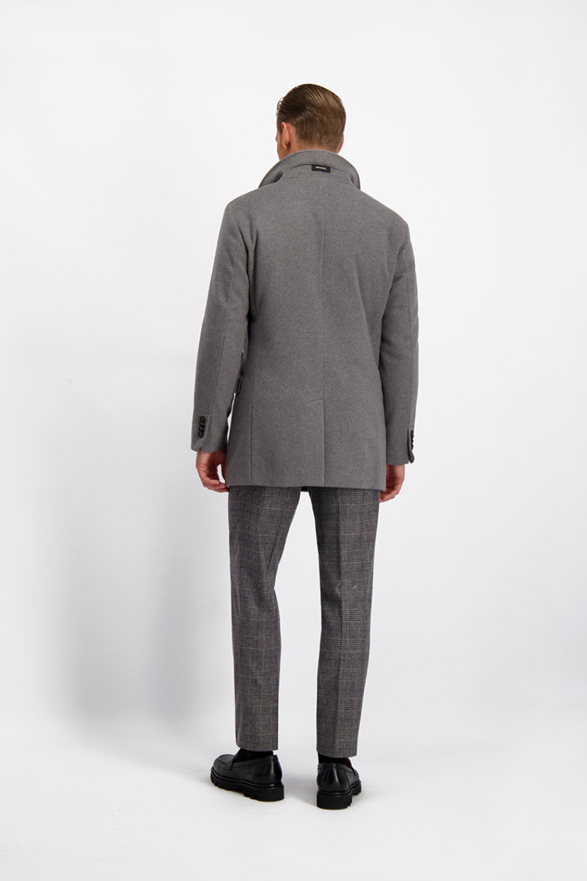 Płaszcz wykonany z najwyższej jakości włoskiej wełny z domieszką kaszmiru. Posiada rozcięcie z tyłu oraz dwie kieszenie cięte zakończone patką. Przy kołnierzu ozdobna sprzączka. Model ma 186 cm wzrostu. Prezentuje rozmiar 50.