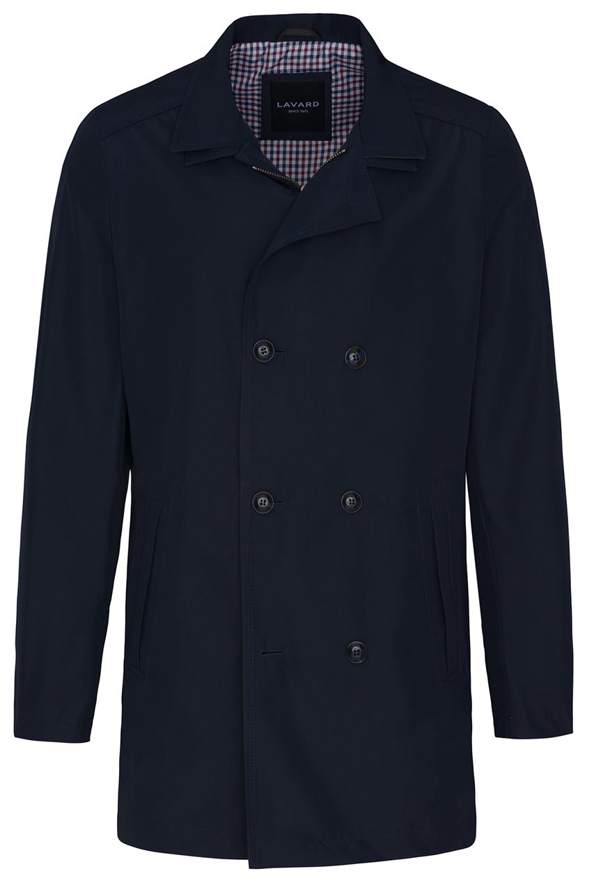 Granatowy płaszcz męski dwurzędowy wykonany z wodoodpornego materiału z delikatną strukturą. Model o regularnym kroju z podwójnym kołnierzem, zapinany na zamek i guziki. Posiada dwie praktyczne skośne kieszenie.