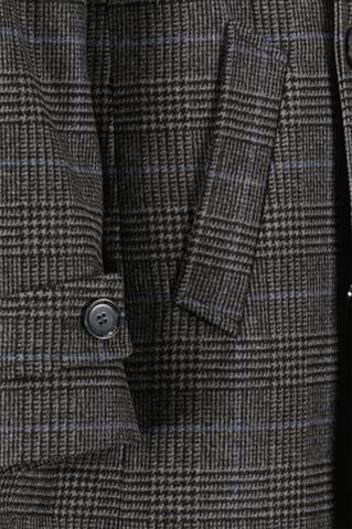 Dwurzędowy płaszcz z podwójnym kołnierzem, zapinany na zamek i guziki. Uszyty został z wysokiej jakości, wełnianej tkaniny. Model ma 186 cm wzrostu. Prezentuje rozmiar 50.