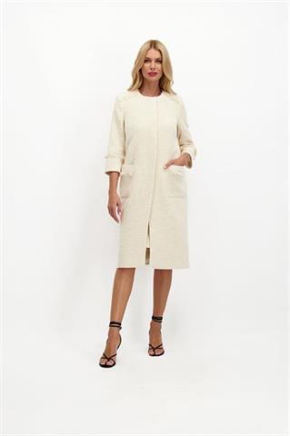 Pudełkowy płaszcz o prostym kroju oraz długości za kolano. Model w ciepłym odcieniu écru. Zapinany na guziki pod krytą plisą. Płaszcz posiada rękawy o długości ¾ oraz ręcznie strzępione taśmy. Model uszyty z tkaniny o wysokiej zawartości bawełny. Posiada dwie kieszenie po bokach.