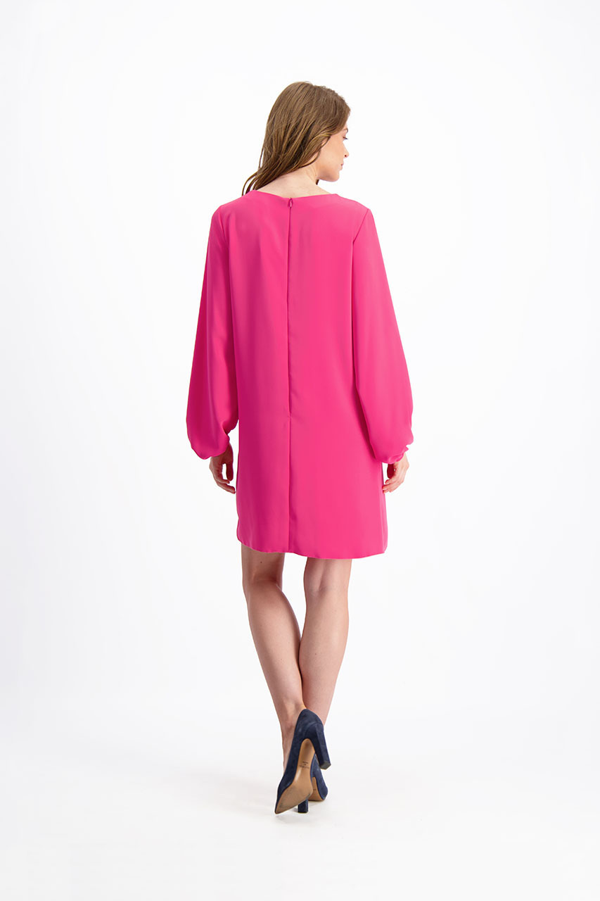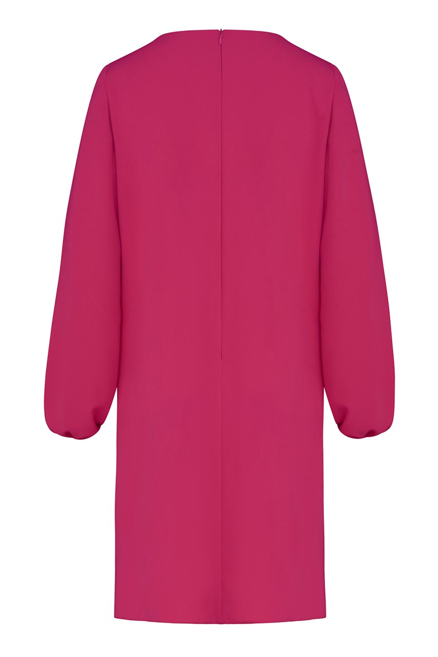 Różowa sukienka koktajlowa z balonowym rękawem. Propozycja o luźniejszym fasonie, który z powodzeniem ukryje wszelkie mankamenty figury. Utrzymana w pięknym i wyrazistym kolorze. Wykonana z gładkiego i przyjemnego materiału. Posiada delikatnie marszczony okrągły dekolt z „łezką” oraz długie szerokie rękawy. Długość ok. 95 cm. Cudowna do eleganckich stylizacji, świetnie spisze się podczas wielu rodzinnych uroczystości. Modelka ma 175 cm wzrostu. Prezentuje rozmiar 36.