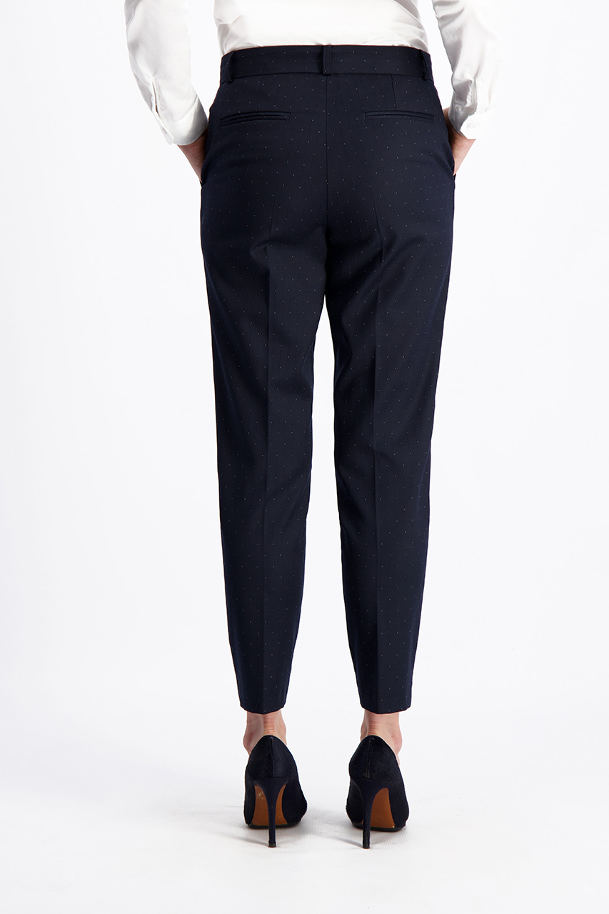 Spodnie damskie w granatowym odcieniu. Model w mikro wzór kropek. Spodnie uszyte z bardzo przyjemnej tkaniny z dodatkiem wiskozy, doskonale układają się na sylwetce. Z marynarką z tej samej tkaniny (85216) tworzą elegancki garnitur damski. Modelka ma 175 cm wzrostu. Prezentuje rozmiar 36.