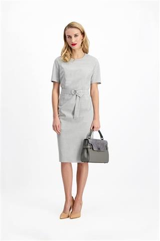 Klasyczna sukienka ołówkowa o długości midi. Utrzymana w szarym odcieniu. Posiada pasek z metalowym zaciskiem oraz raglanowe rękawy. Oryginalnym detalem jest również półkryty metalowy zamek z tyłu. Sukienka z marynarką z tej samej tkaniny (85438) tworzy zestaw. Modelka ma 170 cm wzrostu. Prezentuje rozmiar 36. Wyprodukowano w Polsce.