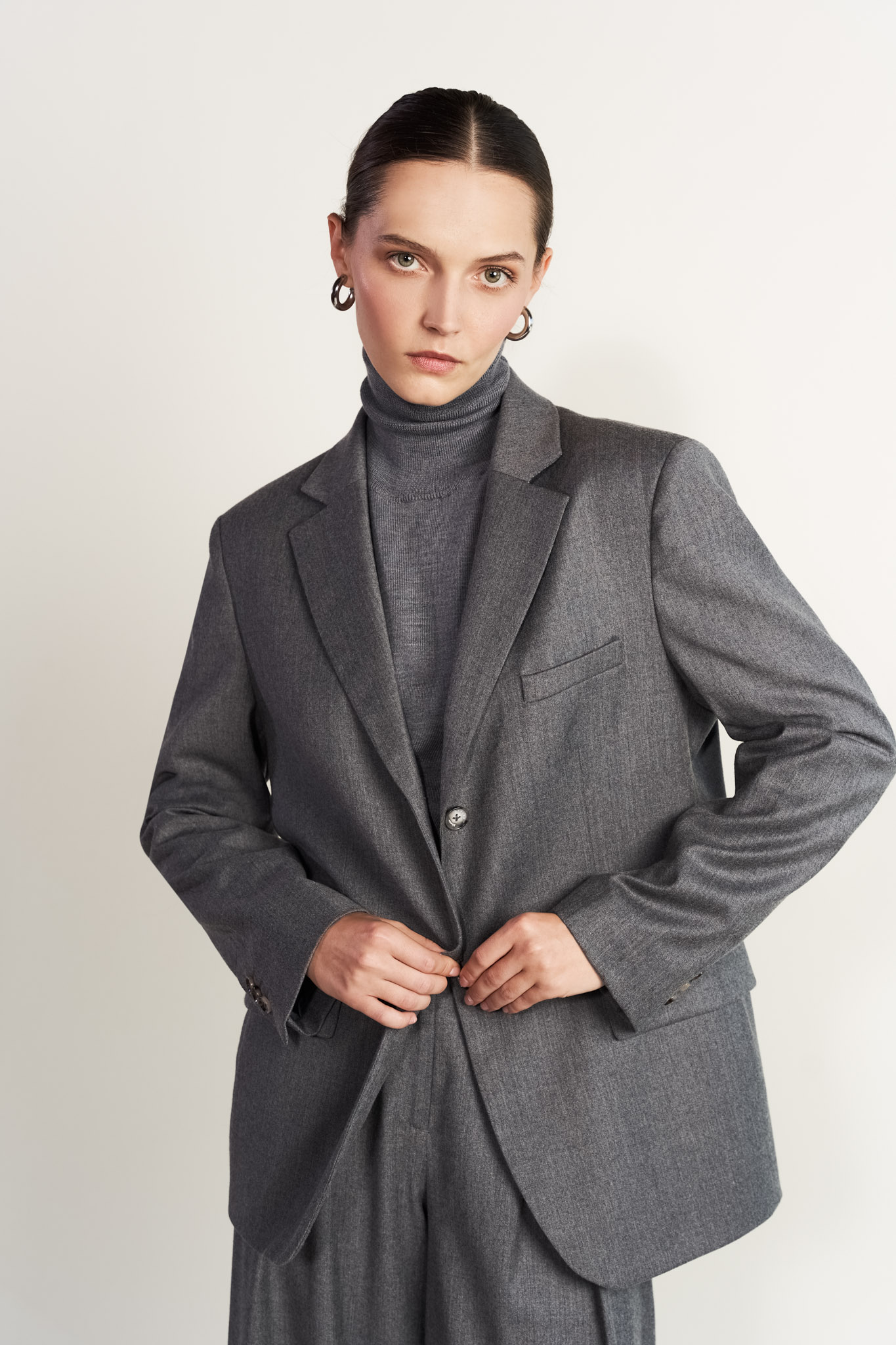 Szara marynarka wykonana ze szlachetnej tkaniny flanelowej z kaszmirem pochodzącej od renomowanego, włoskiego produceta Zignone. Marynarka posiada lekko rozbudowane ramiona. Uszyta w sylwetce oversize. Marynarka ze spodniami (86716) z tej samej tkaniny tworzy garnitur.
