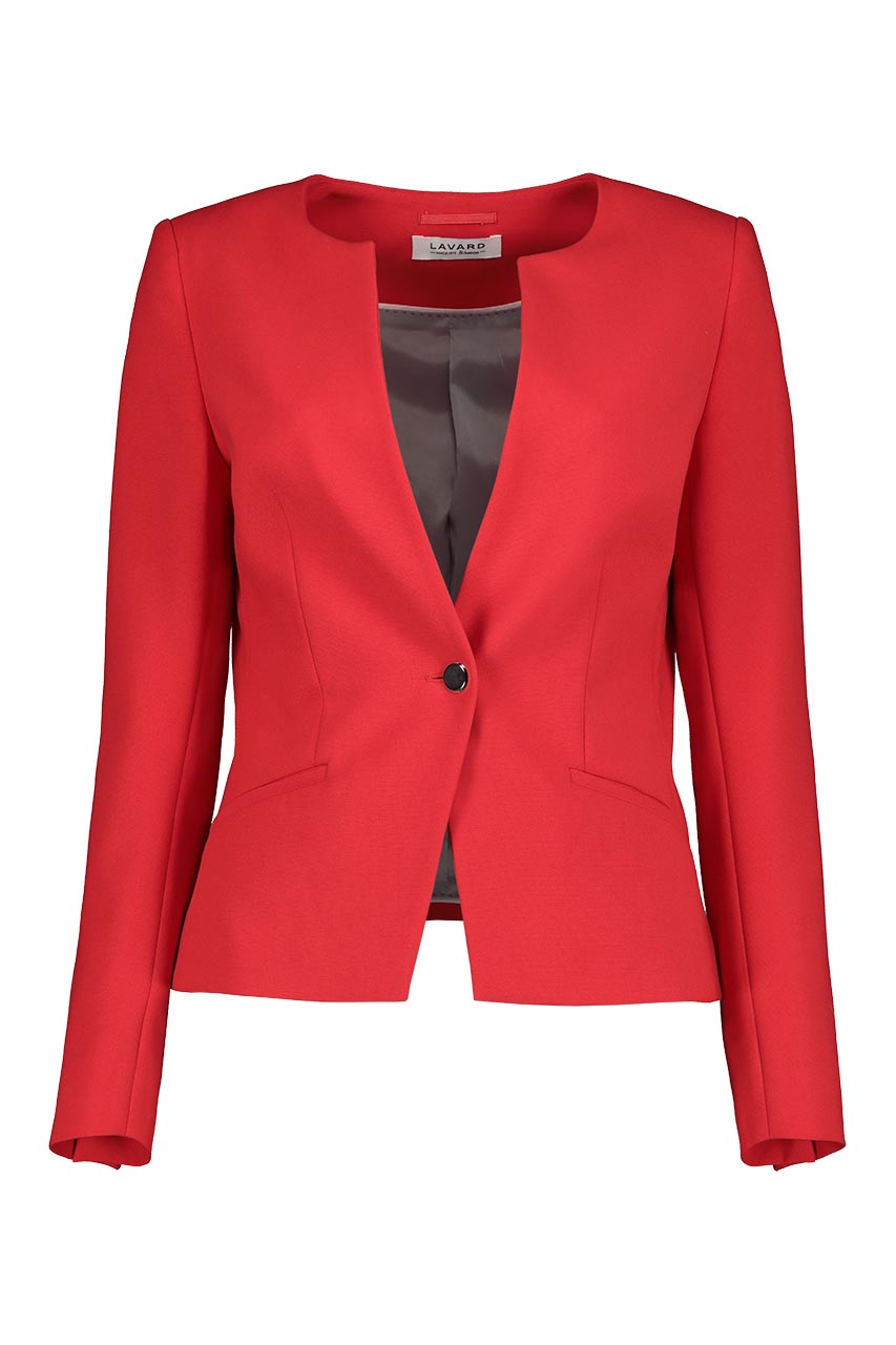Czerwony żakiet damski wykonany z przyjemnej w dotyku tkaniny. Model o klasycznym, lekko taliowanym fasonie. Posiada dwie cięte kieszenie. Żakiet ze spódnicą (84946) z tej samej tkaniny tworzy zestaw.