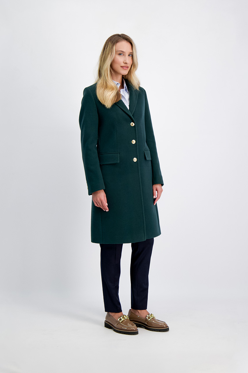 Płaszcz jednorzędowy o kroju dyplomatki. Model uszyty z miękkiej tkaniny o przyjemnym chwycie. Płaszcz zapinany na metalowe guziki w złotym kolorze. Posiada dwie kieszenie z patką. Modelka ma 170 cm wzrostu i prezentuje rozmiar 36. Wyprodukowano w Polsce.