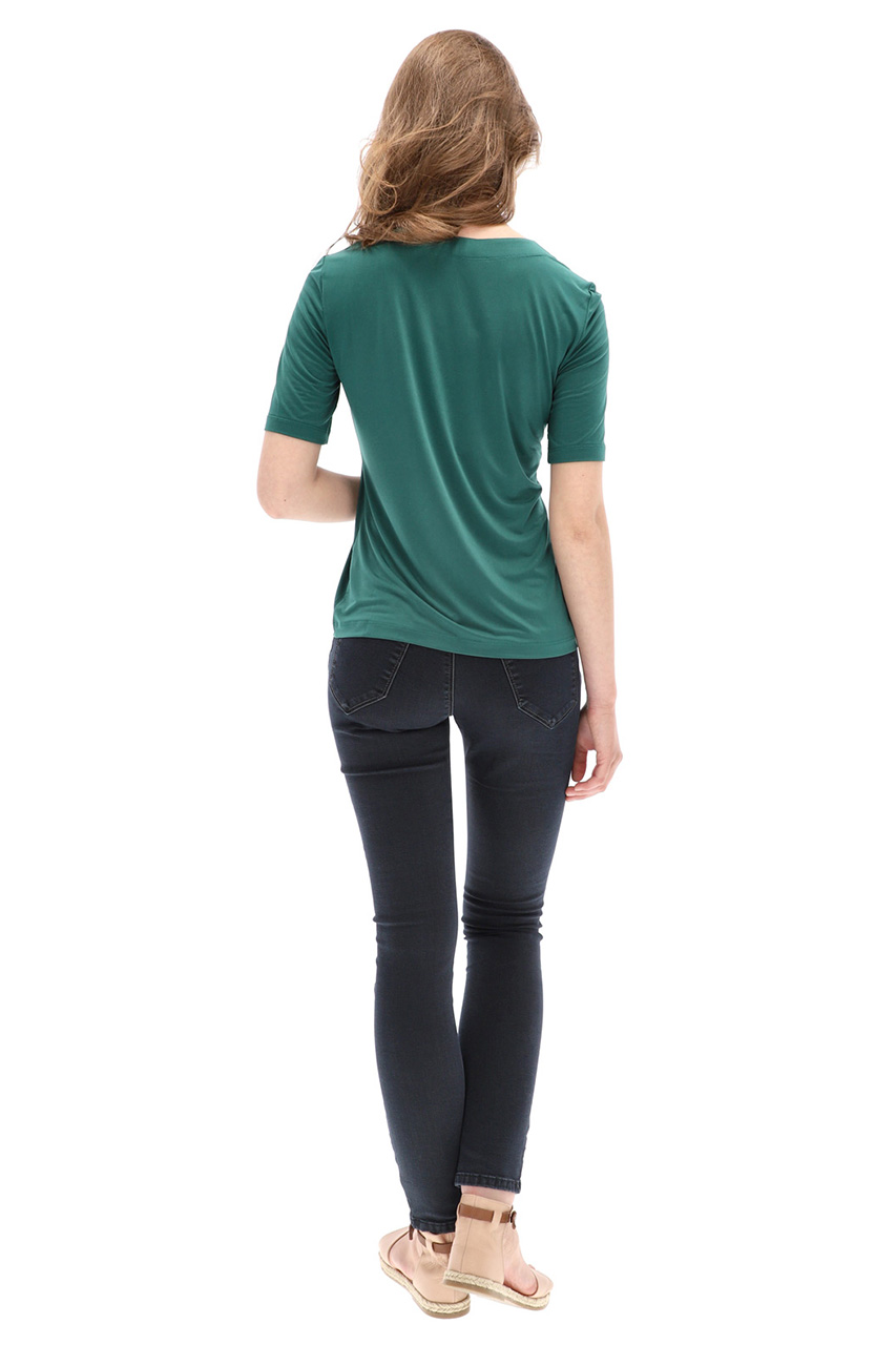 Klasyczny t-shirt w odcieniu butelkowej zieleni, który jest podstawą każdej casualowej stylizacji. Odnajdzie się również w ubiorze formalnym jako minimalistyczna baza pod marynarkę. Odcień pudrowego różu dodaje uroku oraz podkreśla każdy typ urody, a wyjątowo miękka tkanina korzystnie wpływa na komfort użytkowania. Panie z pewnością docenią wygodny krótki rękaw oraz klasyczny okrągły dekolt, który pomoże wyeksponować biżuterię lub efektowną apaszkę.