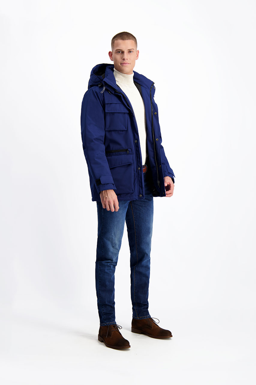 Zimowa kurtka męska w pięknym, ciemniejszym odcieniu niebieskiego. Model wykonany z tkaniny wodoodpornej oraz wiatroodpornej. Zapewnia przyjemne ciepło podczas mroźnej aury, a także odpowiednią cyrkulację powietrza. Propozycja utrzymana w sportowym charakterze, dlatego posiada liczne, funkcjonalne kieszenie oraz odpinany kaptur. Zapinana na zamek i napy. Idealna do jeansów i bawełnianej bluzy lub grubego wełnianego golfa.